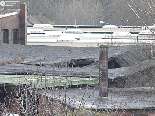 | Am 15.April 2013 von der Fussgängerbrücke aus gesehen: Das Dach, mittlerweile an zwei Stellen eingestürzt. Die weitere Entwicklung >>KLICK |