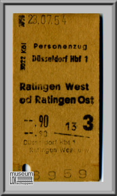 23.07.54 Personenzug 3022 Köl v o n Düsseldorf Hbf 1 Ratingen Westf od Ratingen Ost Gültig 4 Tage --,90l 13 3 |