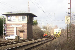 Bereits am 25. September 2004 stand ein Zweiwege-Bagger der Deutsche Bahn Gleisbau (DBG) vor dem Stellwerk Rs an der Sandstrasse bereit. | ||||