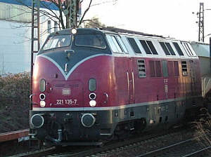 | 221 135 ersetzt zur Zeit Lok 9 der Neusser Eisenbahn im Kalkverkehr nach Rohdenhaus links: 3.April 2006 in Lintorf Link zu einer separaten Seite über den Fahrtrichtungswechsel in Lintorf rechts: 5.April 2006 bei km 16,4 |