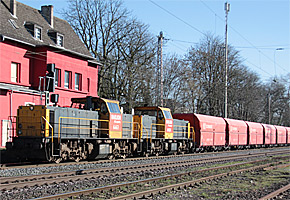 | 01.02.2011 - Kalkpendel Rheinkalk Werk Flandersbach - Hüttenwerke Krupp Mannesmann ist von DB auf TX Logistik übergegangen. Zur Info Link zur F.A.Z. >>KLICK - Dieser Zug in Duisburg Bissingheim >>KLICK - Dieser Zug auf der Angertalbahn >>KLICK |
