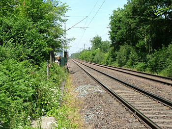 links: Blickrichtung Duisburg - von der anderen Seite, wo mal ein Vegetationsrückschnitt erfolgte (mit 140 383) rechts: Blickrichtung Ratingen, auch dort wurde das Gehölz gekürzt |