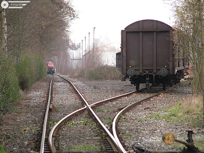 | Ungefähr bei km 12,0 zweigt das Gleis zum Anschluss auf der Ostseite ab. 17.03.2008 Zustand: Es sieht nach "stillgelegt" aus. 2009 Zustand abgebaut bis auf ein kurzes Teilstück. Heute nicht mehr vorstellbar: Ganze Autozüge hatten als Ziel Lintorf >>KLICK Ganzzug VW-Golf |