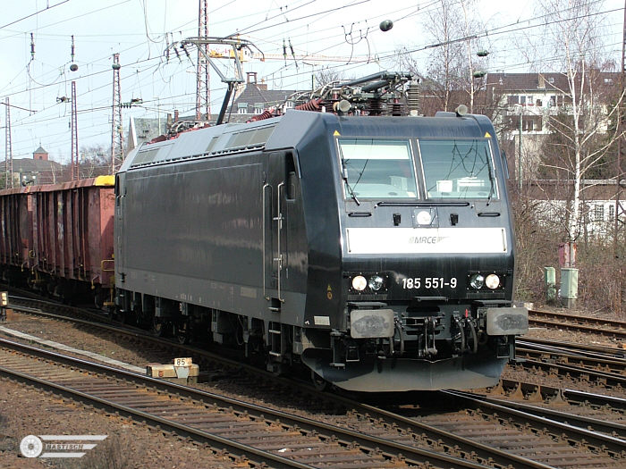 185 551 am 7.März 2006 in Düsseldorf- Rath gegen 14:00 Uhr Gegen 13:30 Uhr war sie von einer Leihlok der Neusser Eisenbahn aus dem Anschluss in den Rangierbahnhof geschleppt worden und hatte sich dann bis kurz vor 14:00 Uhr hinter 225 081 und deren Zug "versteckt" |