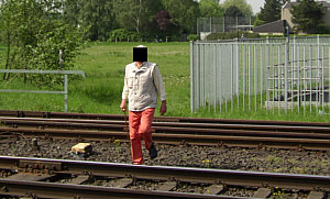 27.September 2017 - Bahnübergang Kalkumer Strasse in Lintorf: Bei ROT zeigendem Lichtsignal noch in den Schrankenbereich reingelatscht und "das Ziel nicht mehr schnell genug erreicht". Da ich die Persönlichkeitsrechte dieser Person nicht verletzen will, habe ich dieser Person mal die passende Kleidung übergezogen.