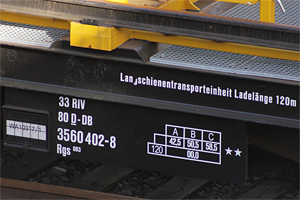| Beladene Langschienentransporteinheiten (ThyssenKrupp Langschienen) am 9.November 2013 in Düsseldorf-Rath | |