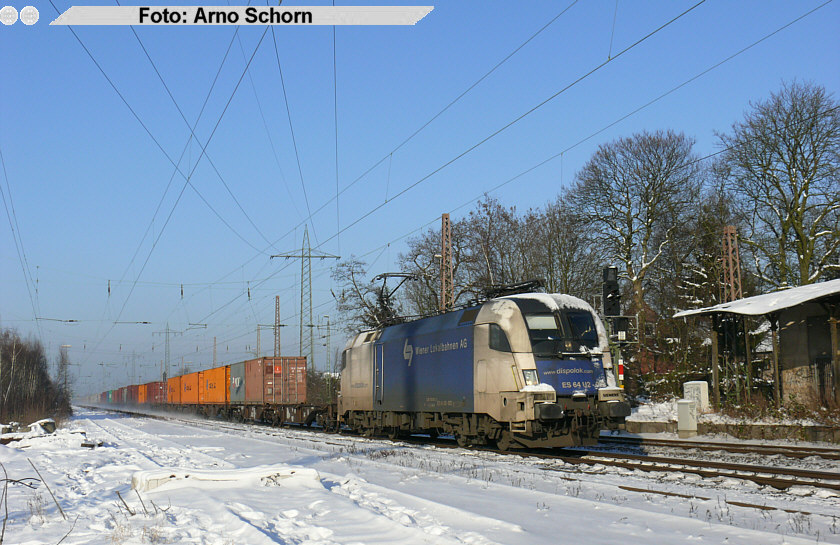 | 1. Februar 2009 Kurz, ganz kurz, gab es noch einmal Schnee. Bei den ersten Zügen, die zu diesem Zeitpunkt über die Strecke fuhren, gab es "erfrischendes" Schneegestöber für an der Strecke Wartende. Links: 189 092 mit |