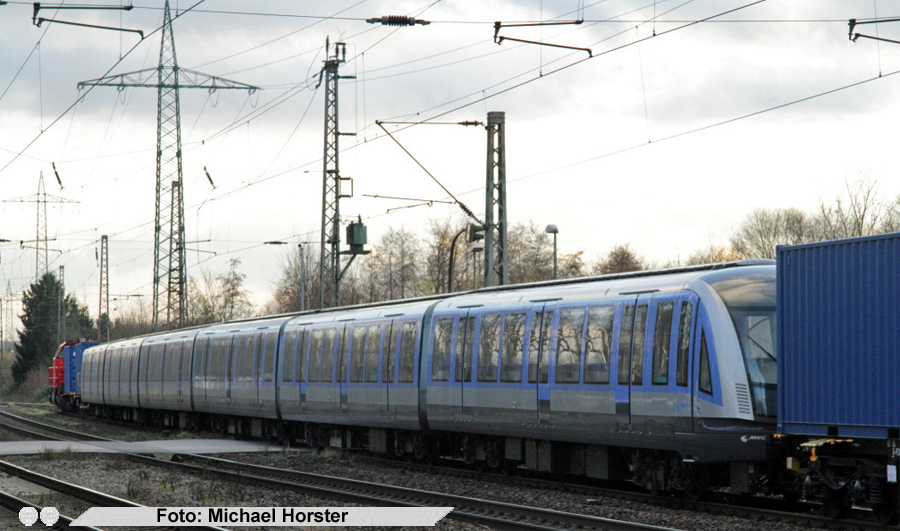 | Die vordere Hälfte des U-Bahn-Zuges etwas mehr von der Seite |