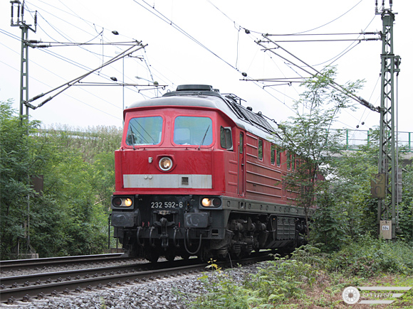 | Der sonntägliche Zugverkehr lief am 25.Juli 2010 weiter. Genutzt wurde allerdings zwischen Abzw. Tiefenbroich und Duisburg-Wedau das Gleis der Gegenrichtung. Hier 232 592 mit Kalkzug aus Rohdenhaus bei km 12,0 | |||