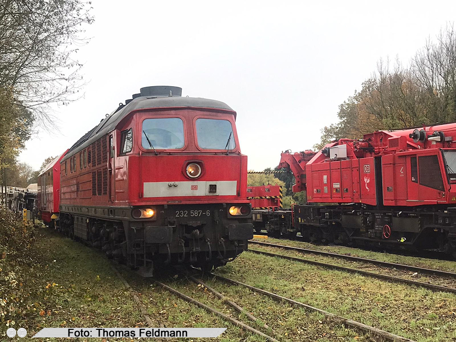 232 587 mit Hilfszuggerätewagen auf Gleis 3 in Flandersbach